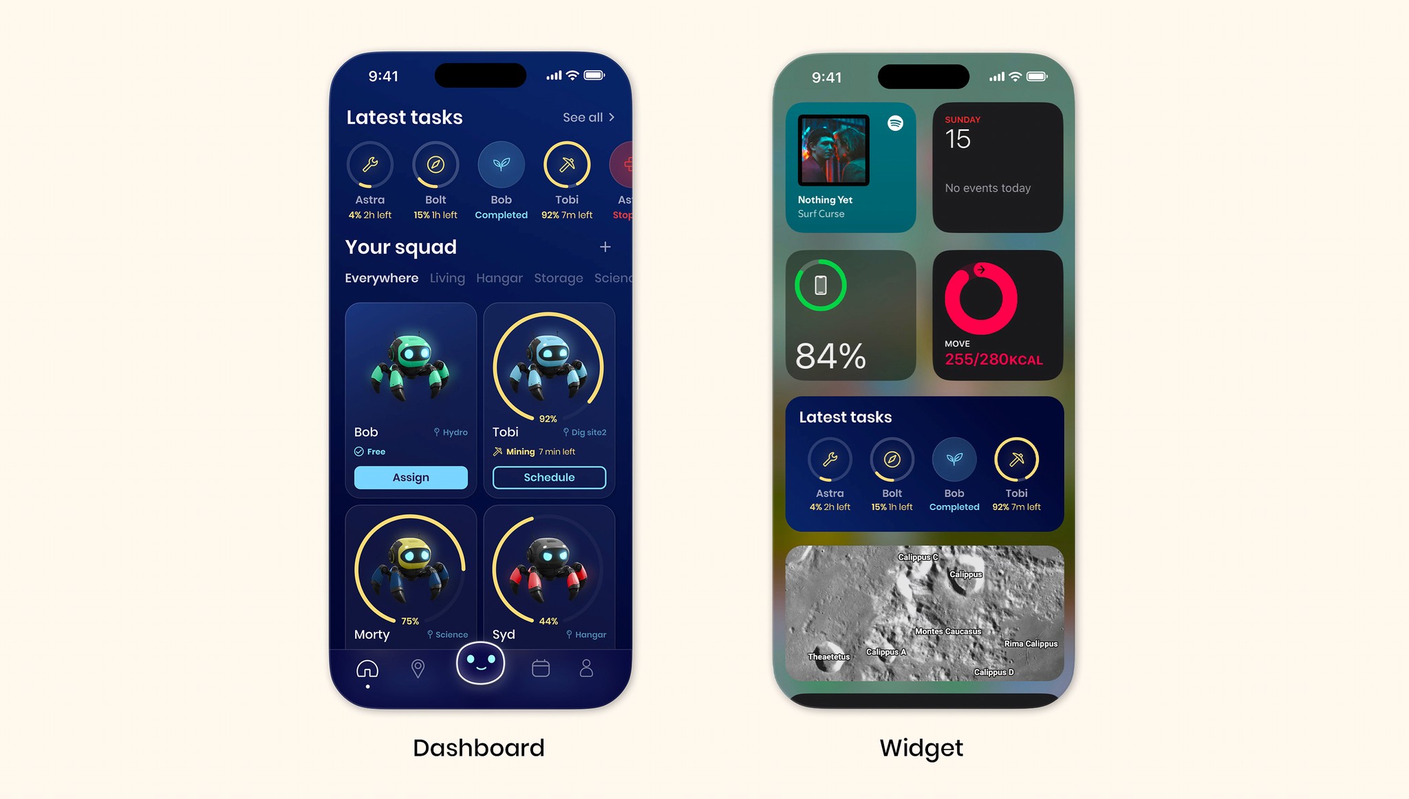 To speed things up even more, I designed a home screen widget for instant access to bot activity and mission updates, allowing users to stay informed without opening the app.